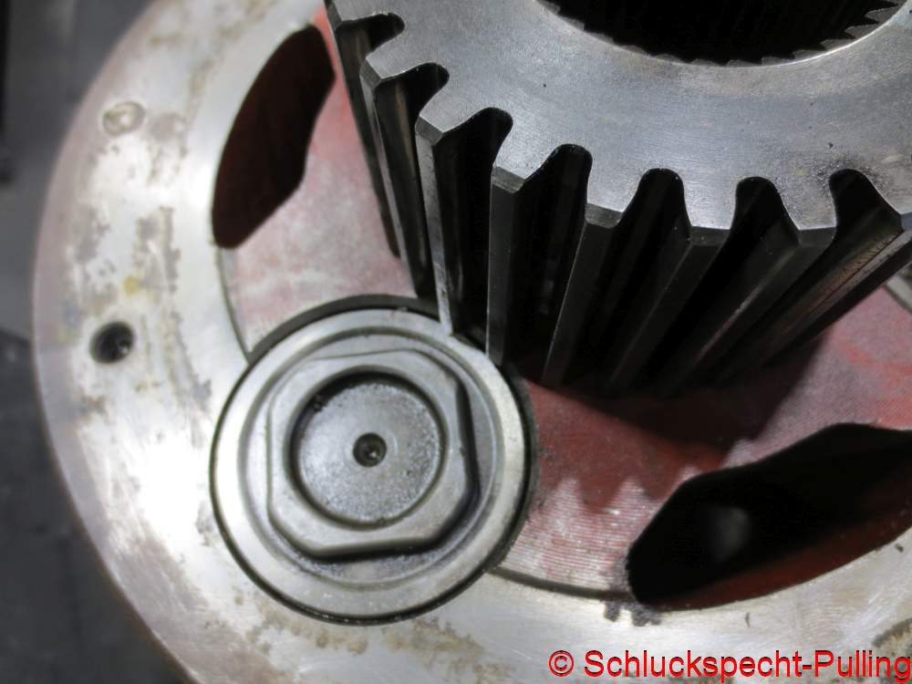 Gleiches Thema, andere Teile. Die Muttern halten den Hohlradträger an Ort und Stelle und spannen die Kegelrollenlager vor.