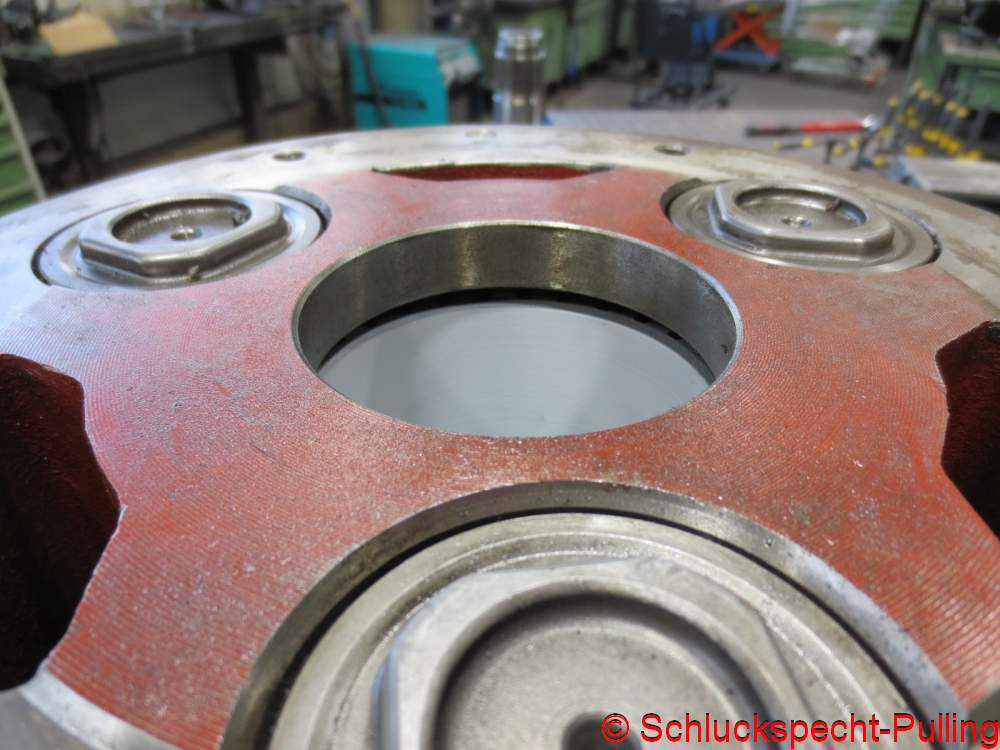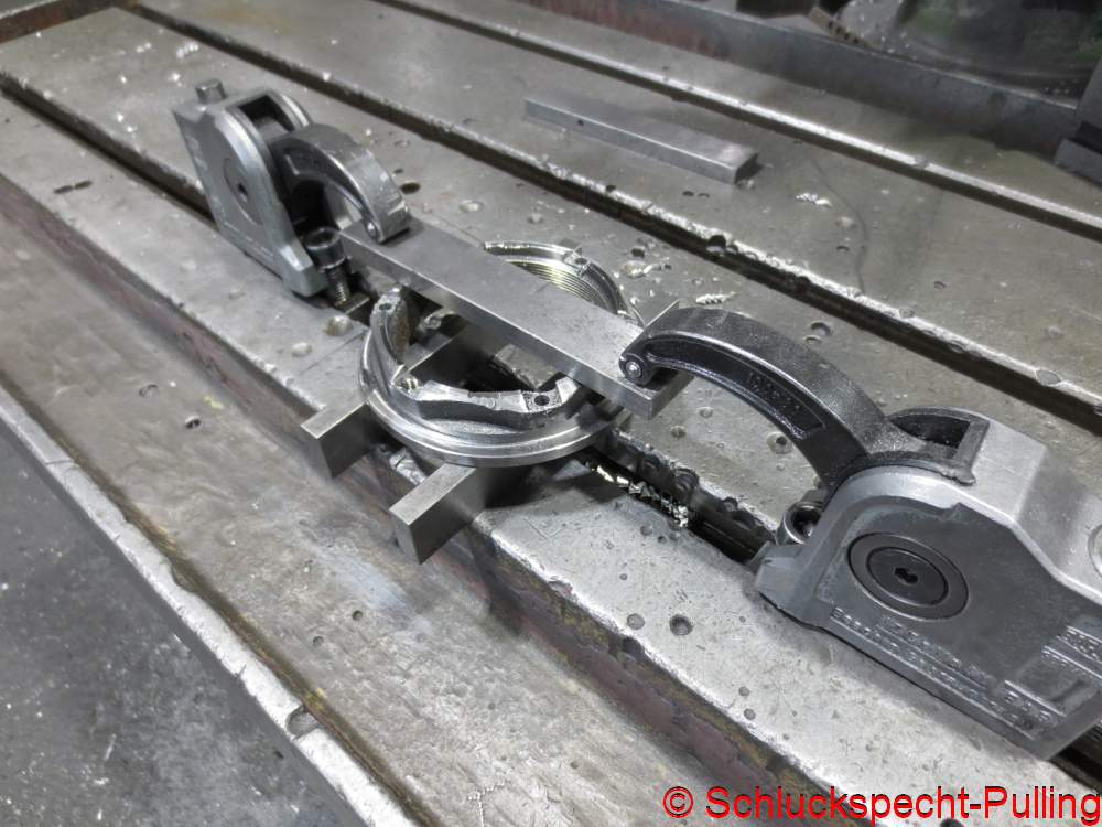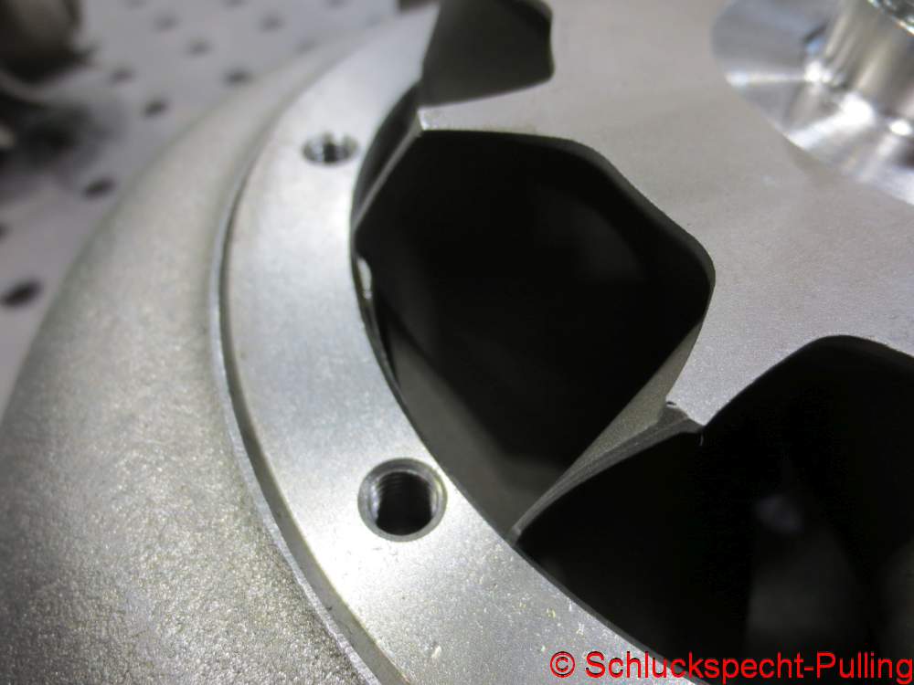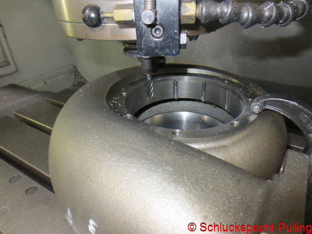 Ab auf die Fräse und fix ein paar Aussparungen für die Flügel eingearbeitet. Dann passt die Turbine rein und das Lagergehäuse ist trotzdem zentriert. Ich weiß gar nicht mehr wer mir den Tipp gegeben hat, meine Idee war das nicht. Ich will mich ja nicht mit fremden Federn schmücken. 😉