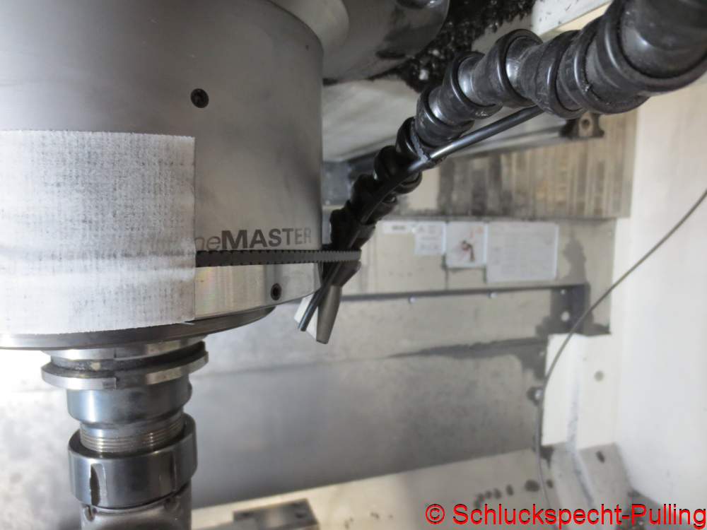 Da unsere Fräsen allesamt ohne Kühlmittel laufen, musste ich mir was anderes einfallen lassen. So wanderte ein 4mm Pneumatikschlauch an das Gelenkdingen für die Blasluft.