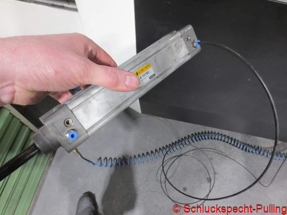 Das andere Ende fand seine vorläufige Parkposition in einem alten Pneumatikzylinder. Kleiner Tipp: Der Zylinder ist mit Schmierstoff zur Aluzerspanung gefüllt. Sozusagen eine metallene Spritze. Einfacher ging es nicht. 😉