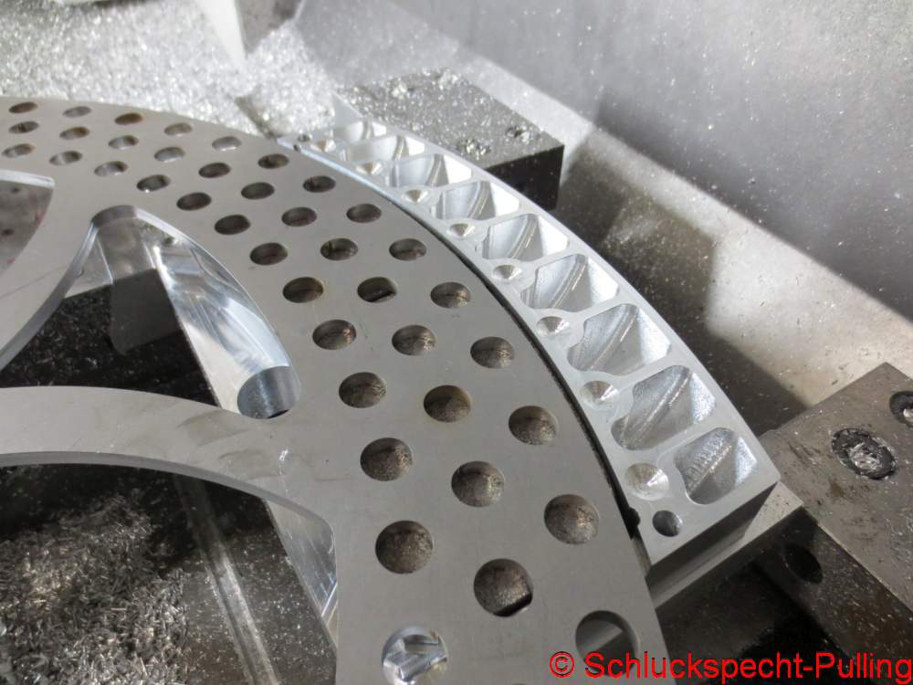 Eigentlich jammerschade das so viel von dem edlen Zeugs zerspant wird, aber es soll ja leicht werden. Die Kolben haben später mal 48mm Durchmesser und die Bremsscheibe misst 660mm. Ich denke das wird ganz gut zupacken. 😉 😉
